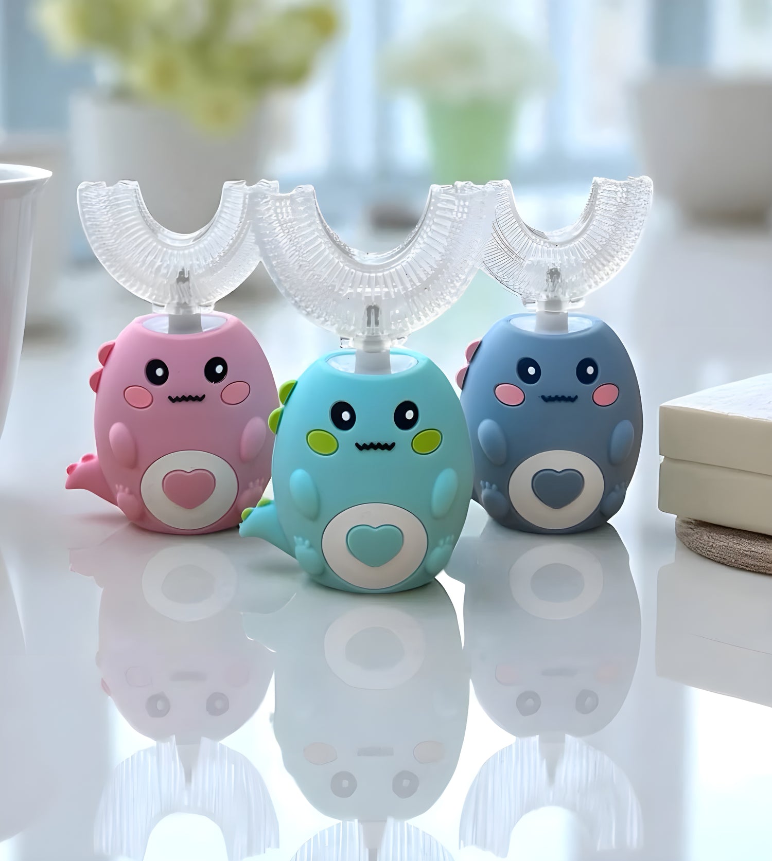Met de DinoBrush™ verandert tandenpoetsen in een vrolijk avontuur. Deze elektrische tandenborstel in schattige dinosaurusvorm laat kinderen spelenderwijs aan de slag gaan. Het speelse design met zachte siliconen en felle kleuren is onweerstaanbaar voor kleintjes. Dankzij de U-vormige borstelkop krijgt elk tandje in één beweging aandacht en is het gebit in slechts 60 seconden schoon. Zo ontwikkelt jouw kind zelfstandig een goede poetsroutine – voor een stralend gebit én meer rust voor jou.